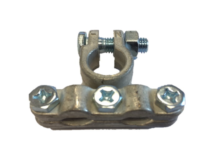 Accupoolklem voor de negatieve pool en is voorzien van 3 aansluitpunten. Middelste bout M10 en 2 bouten M6