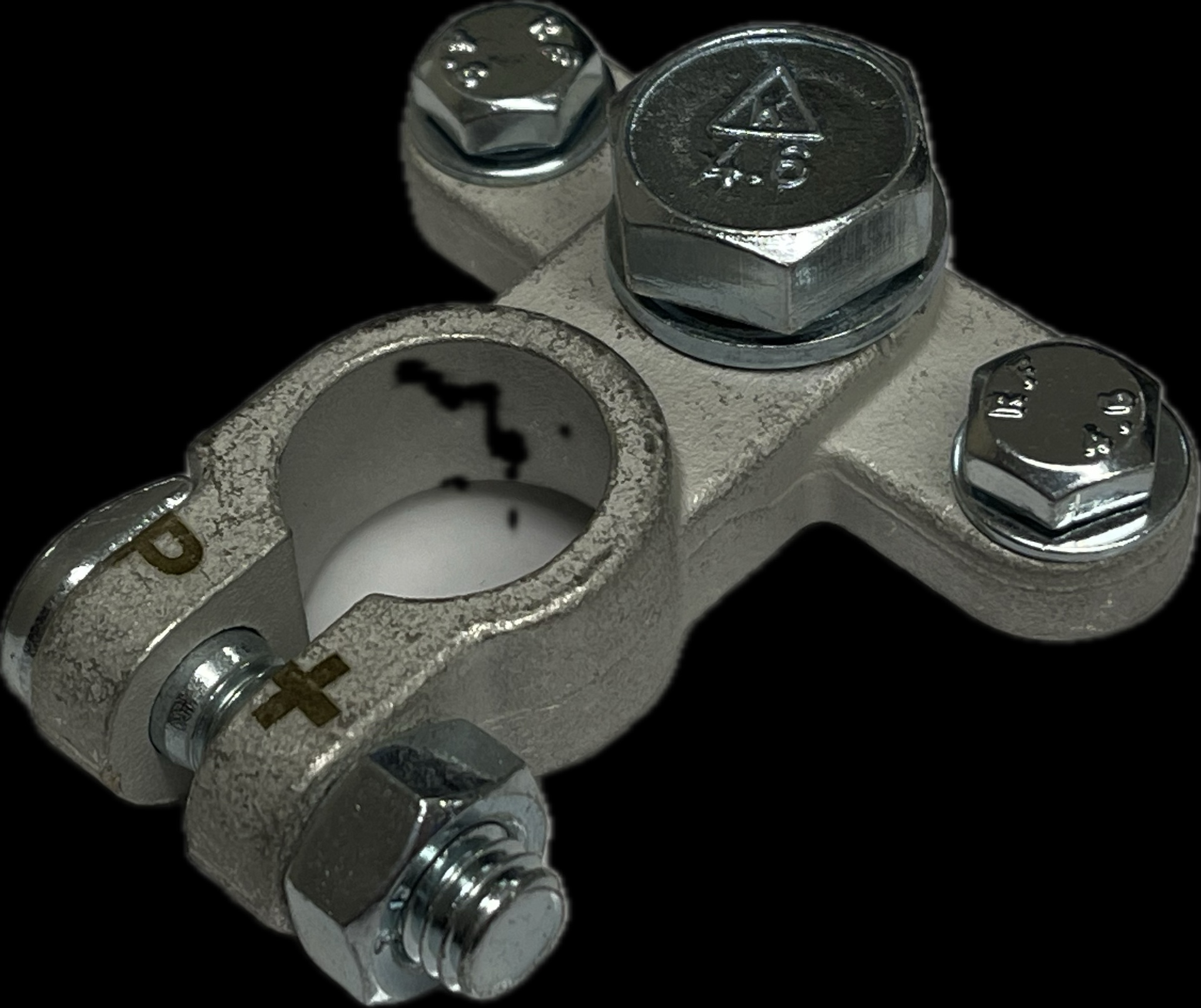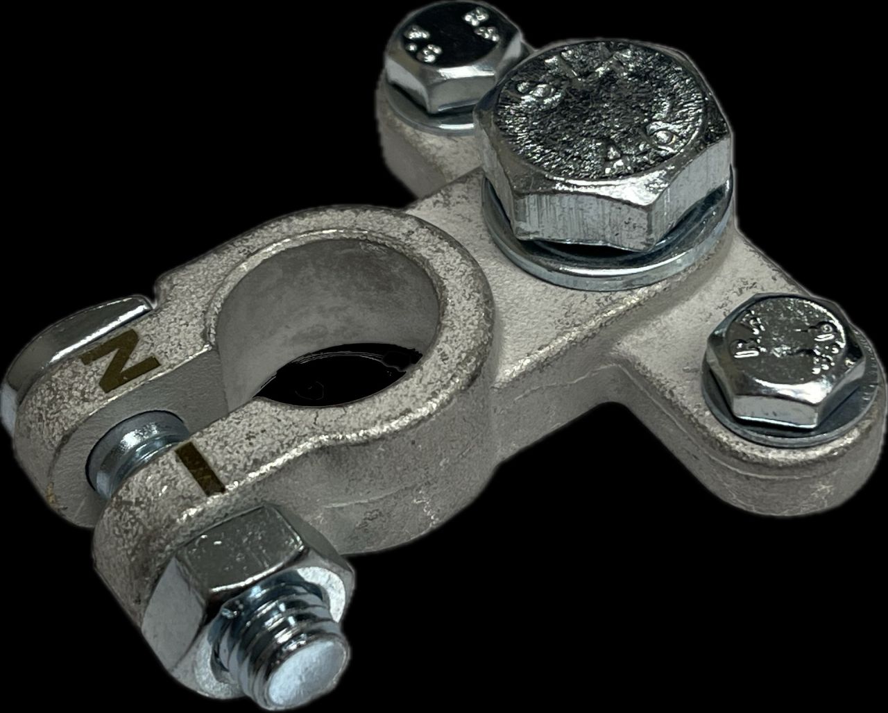Accupoolklem voor de negatieve pool en is voorzien van 3 aansluitpunten. Middelste bout M10 en 2 bouten M6